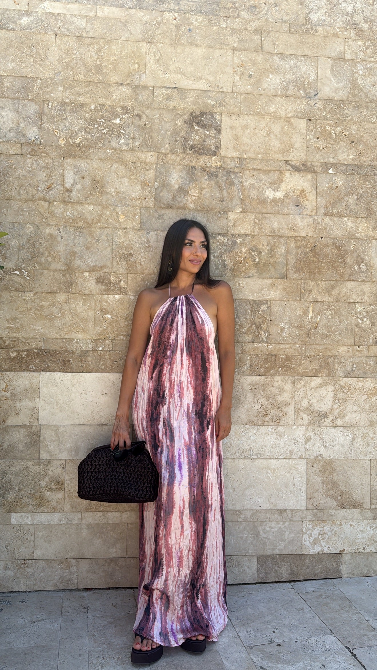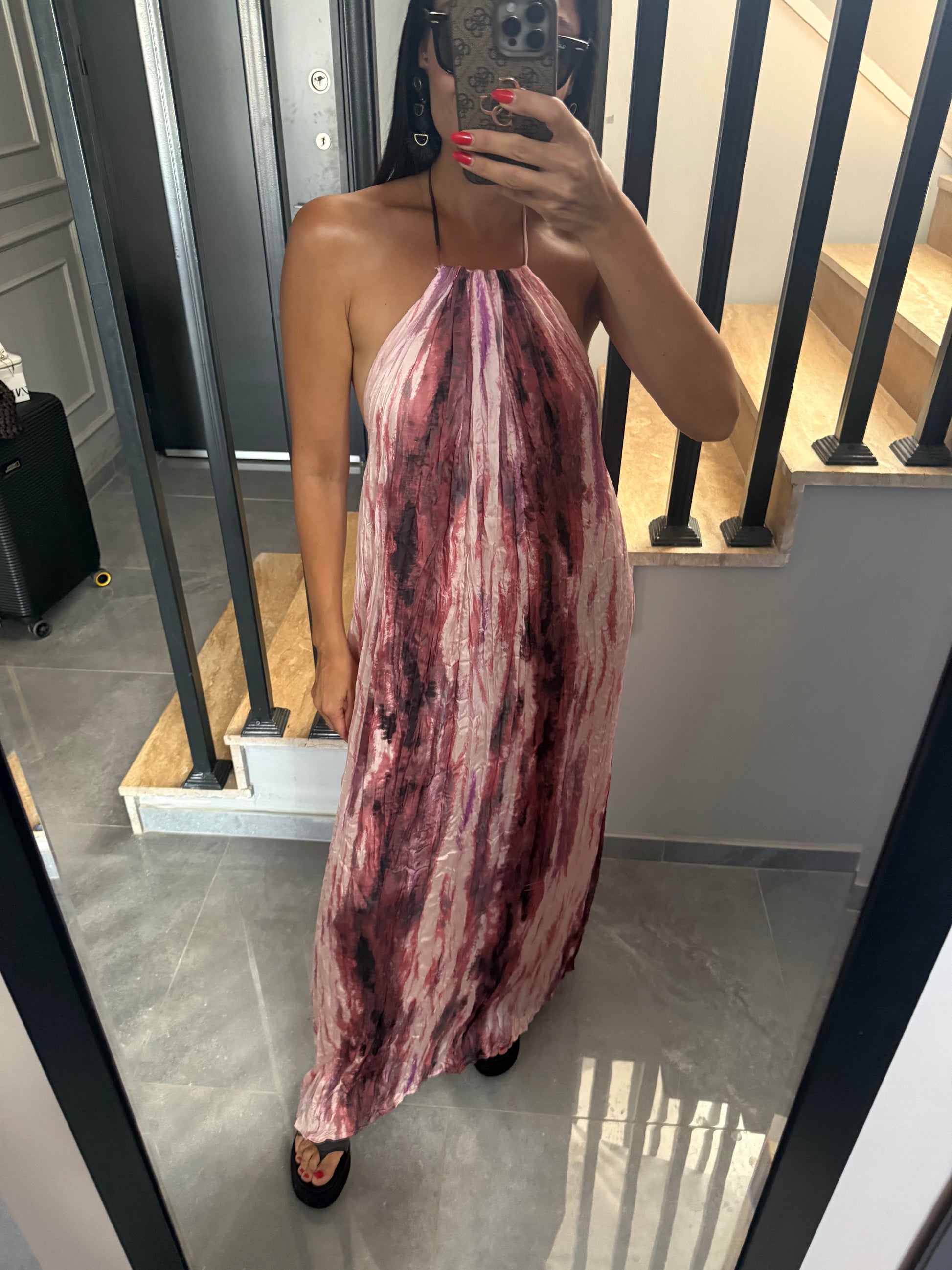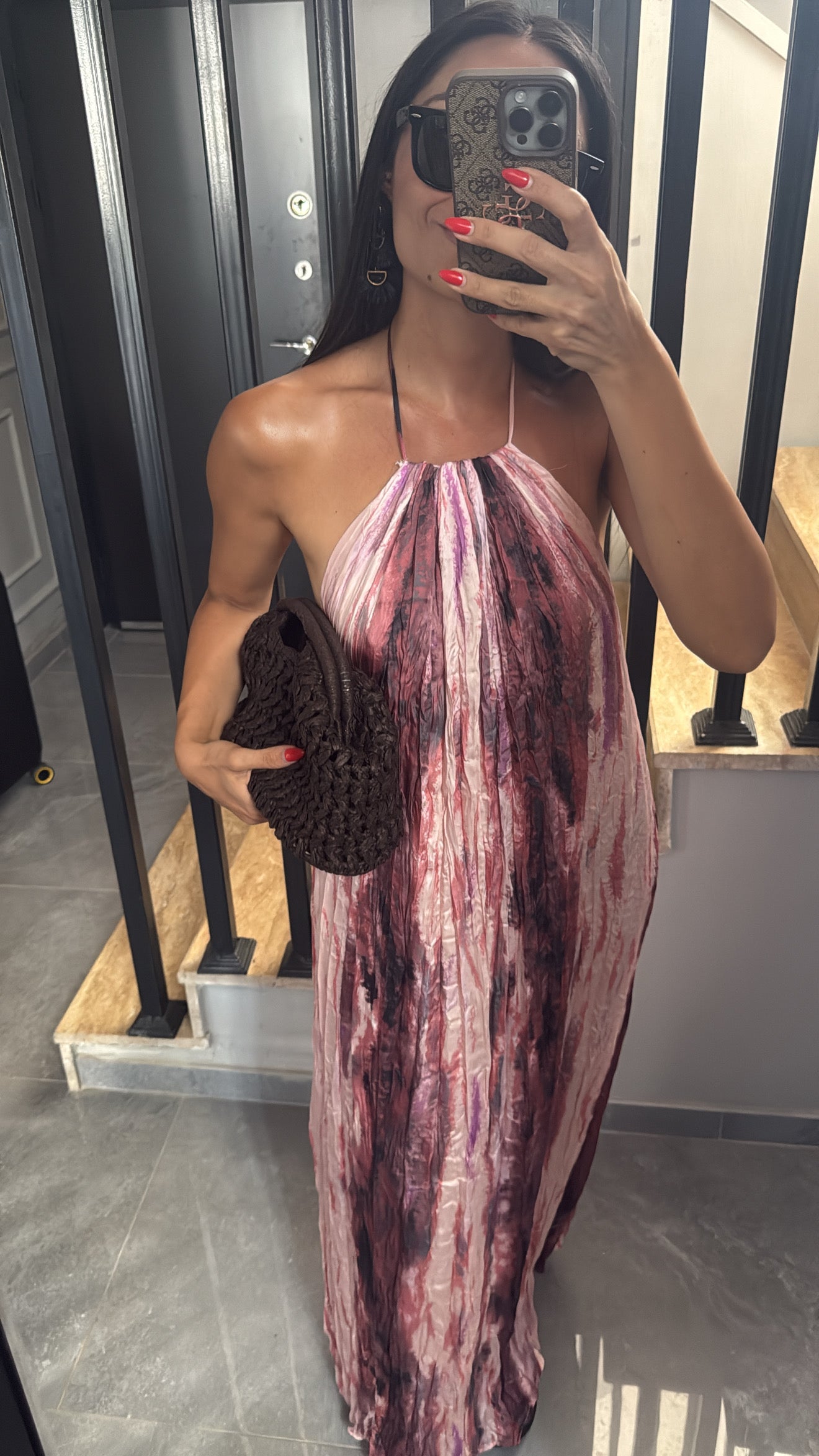 BATİK DESENLİ ASTARLI SATEN PEMBE ELBİSE