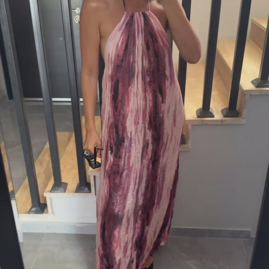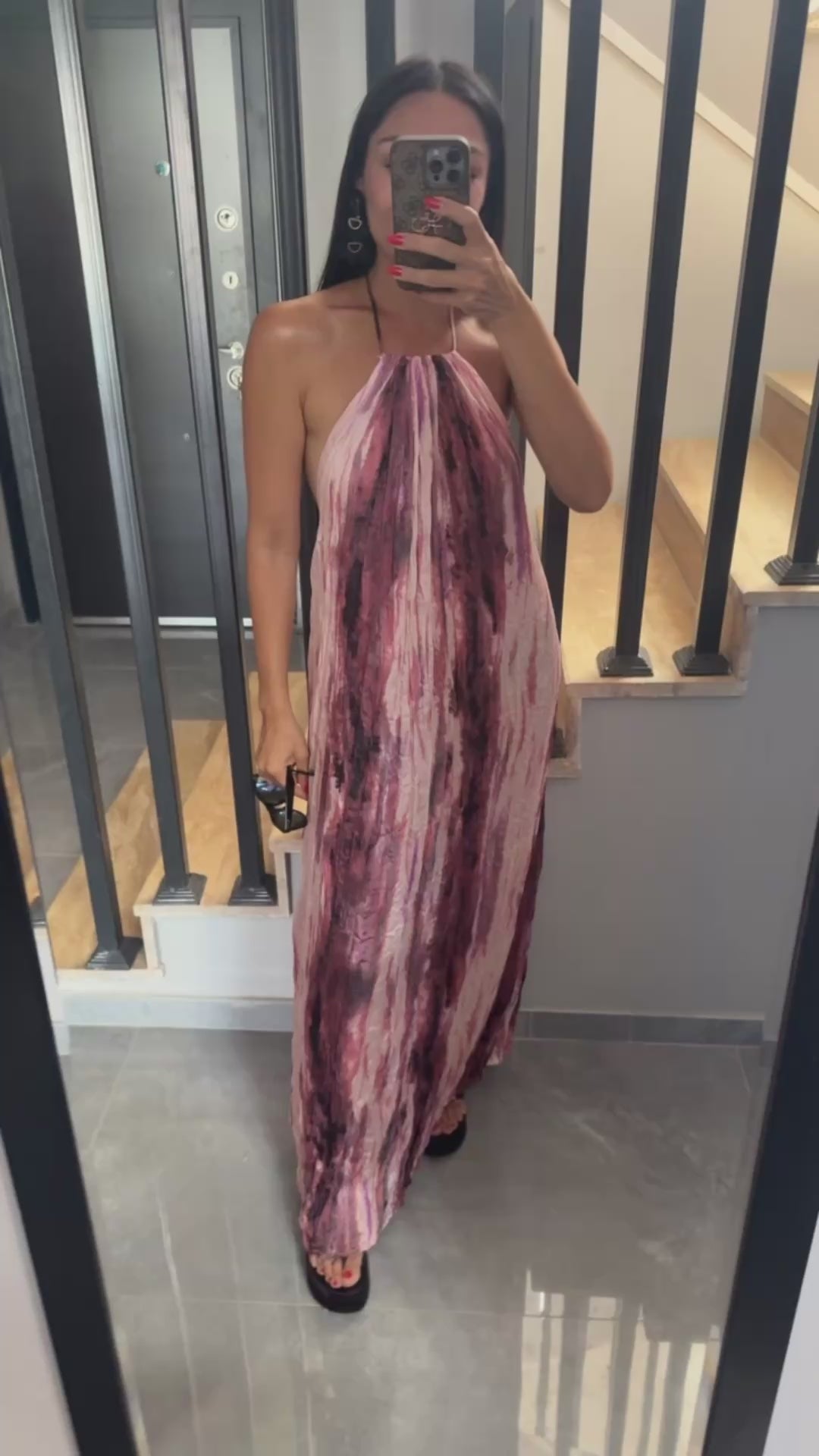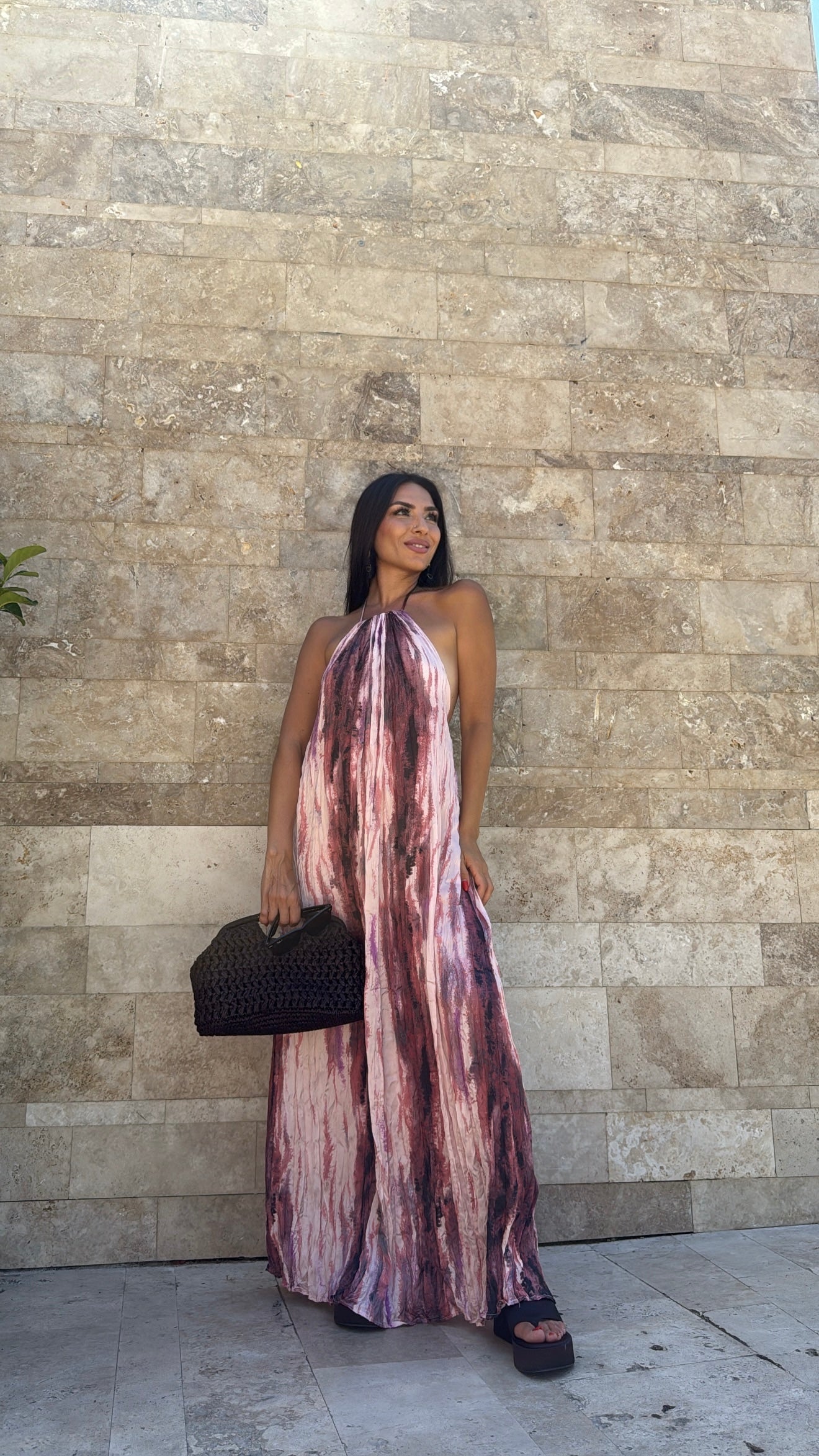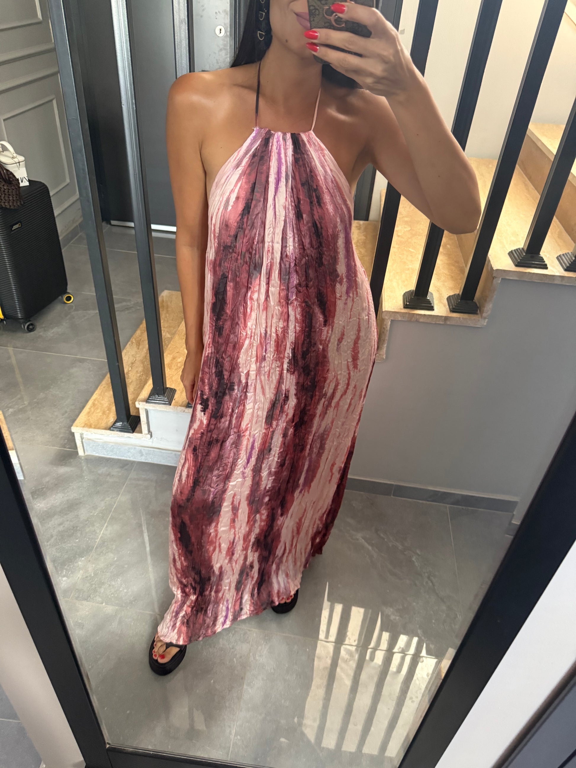 BATİK DESENLİ ASTARLI SATEN PEMBE ELBİSE