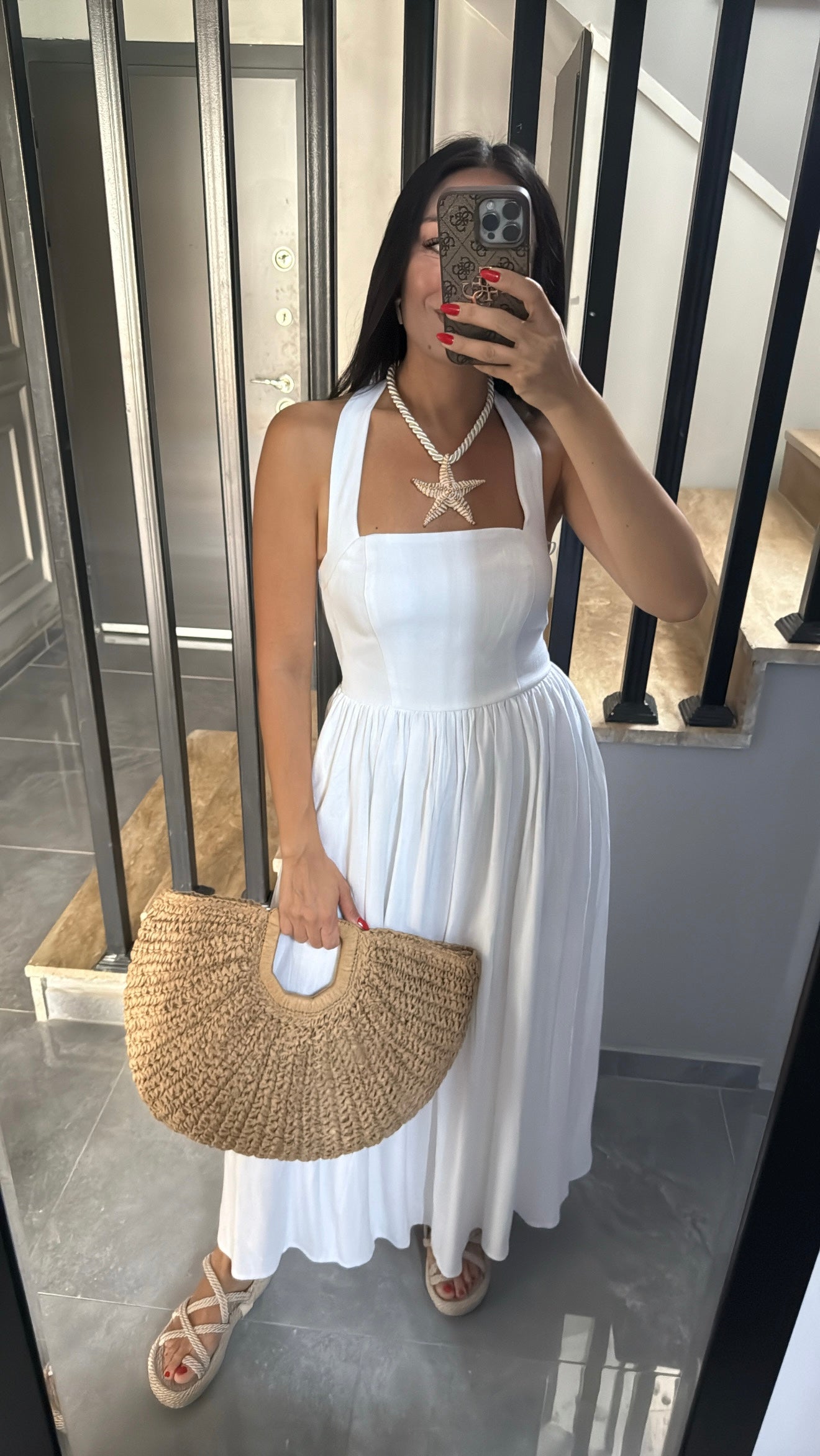 Boyundan Kalın Askılı Sırt Dekolteli Keten Elbise Ekru