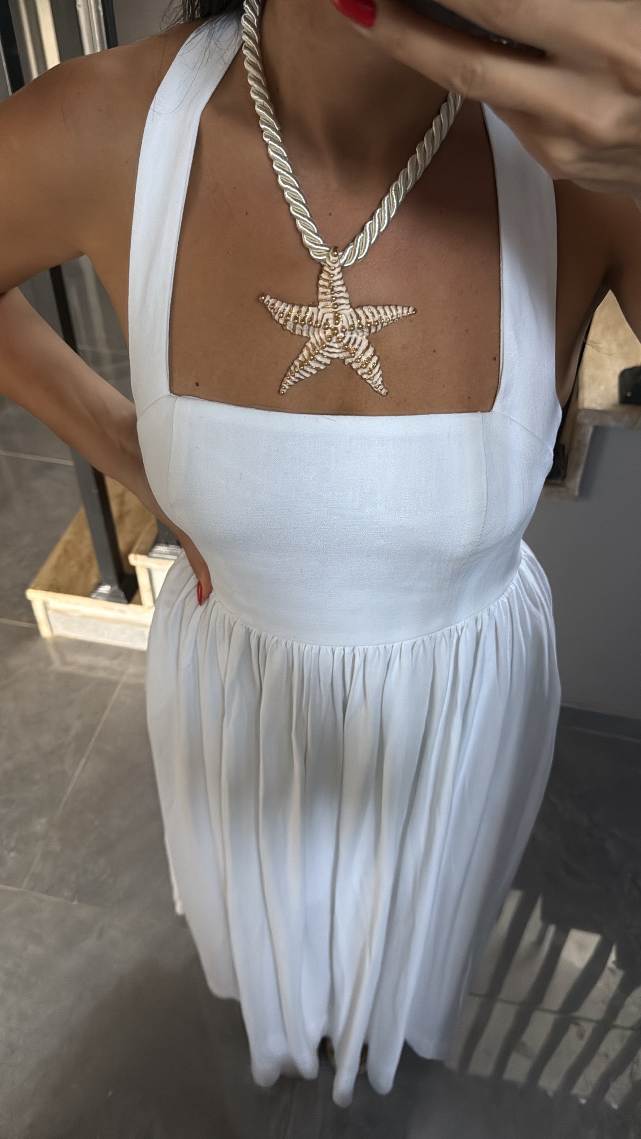 Geniş askılı, astarlı, sırt dekolteli, kare yaka, boyundan düğme kapamalı, yandan fermuarlı, sırtı lastikli, beli büzgü detaylı, uzun boy keten elbise.