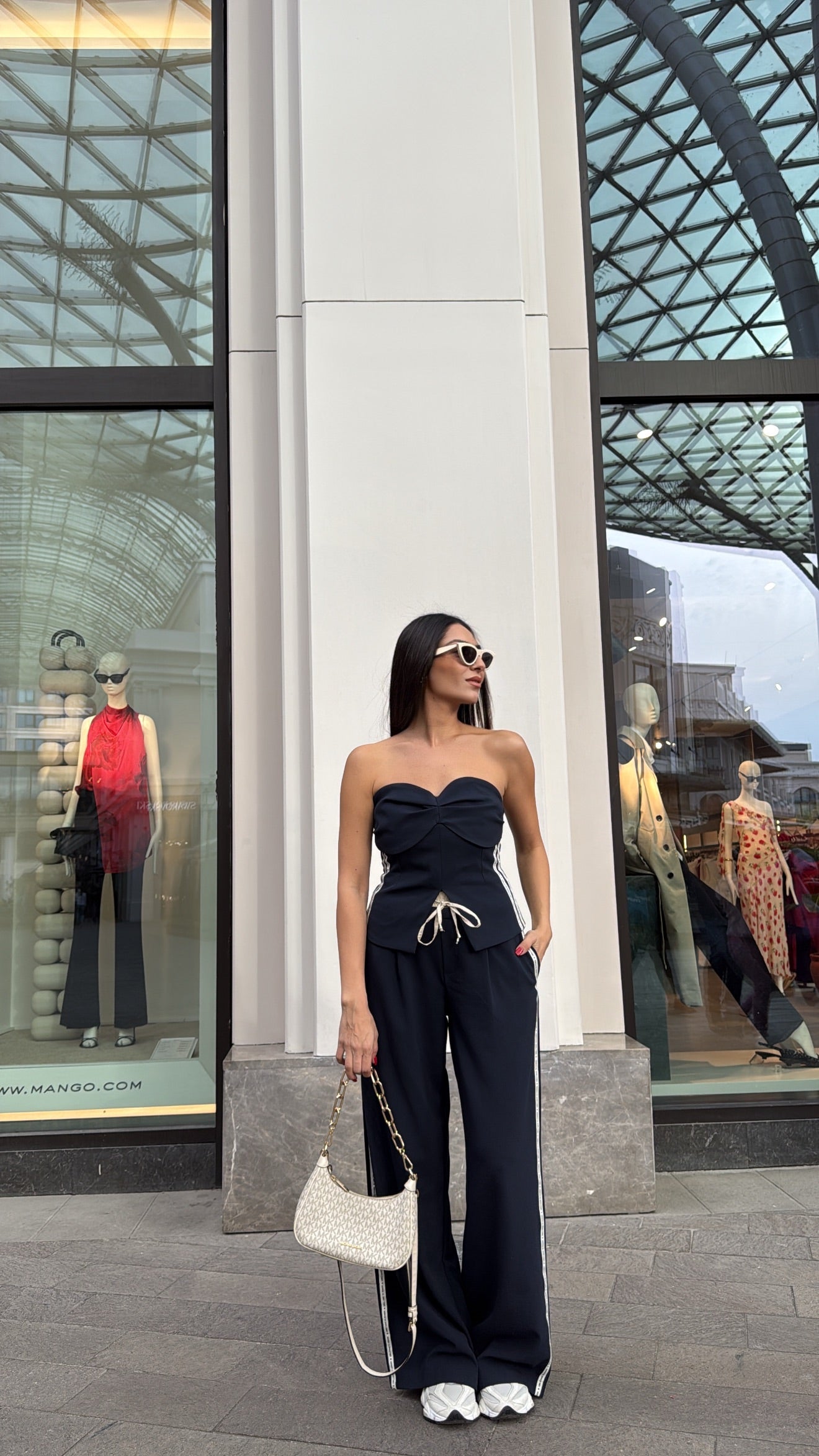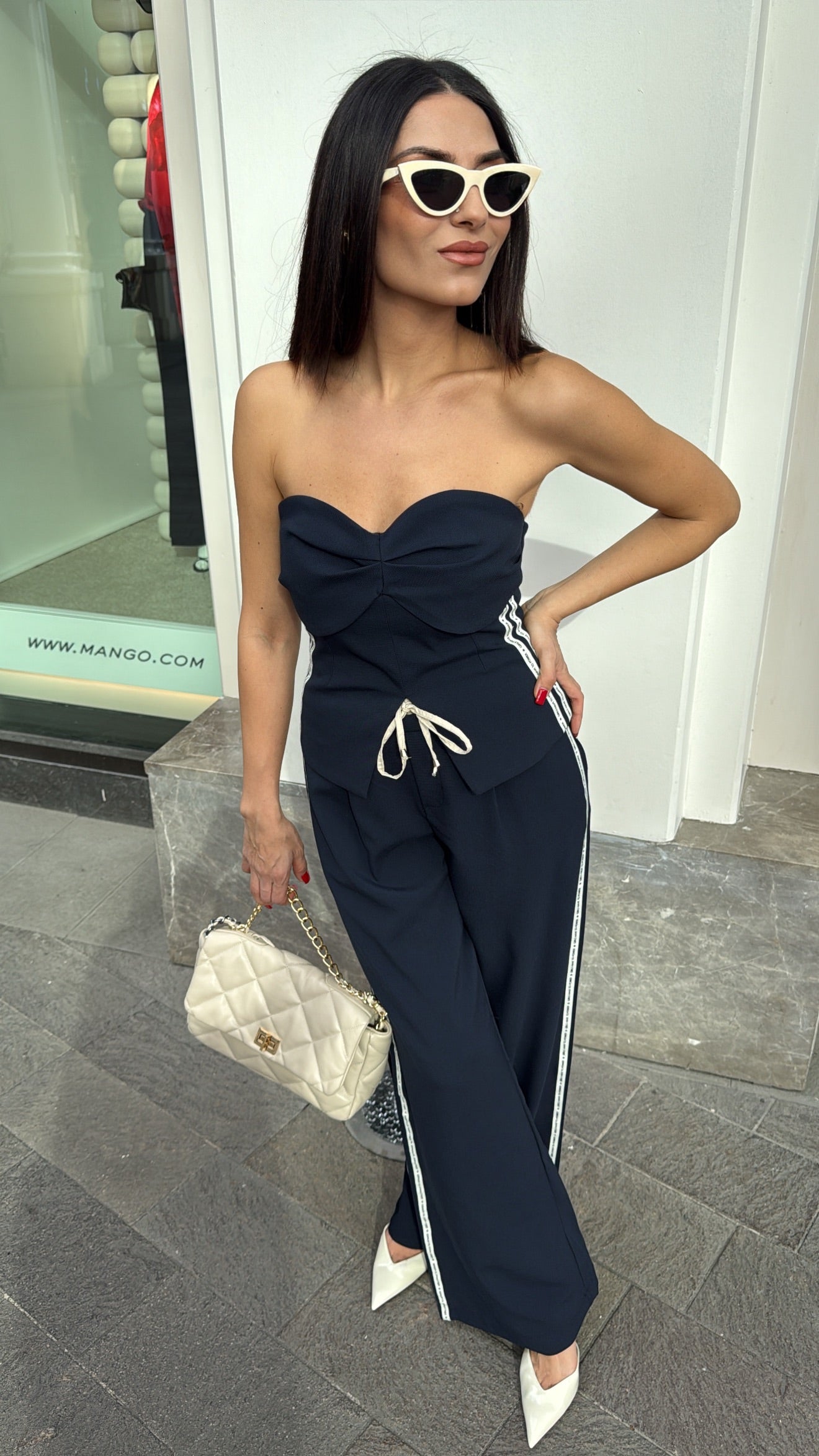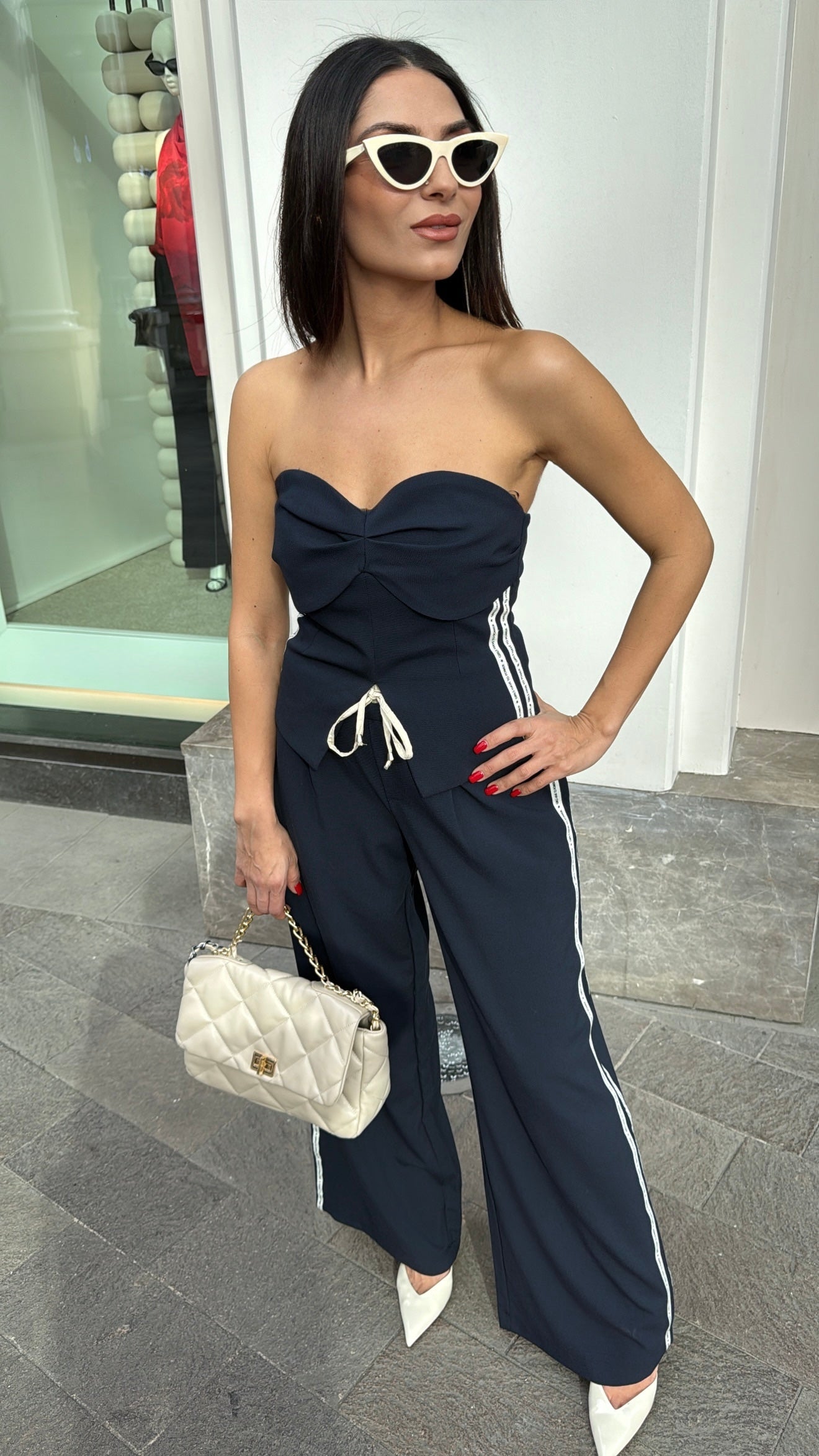 Lacivert Şeritli Baskı Detaylı Straplez Bluz Pantolon Takımı