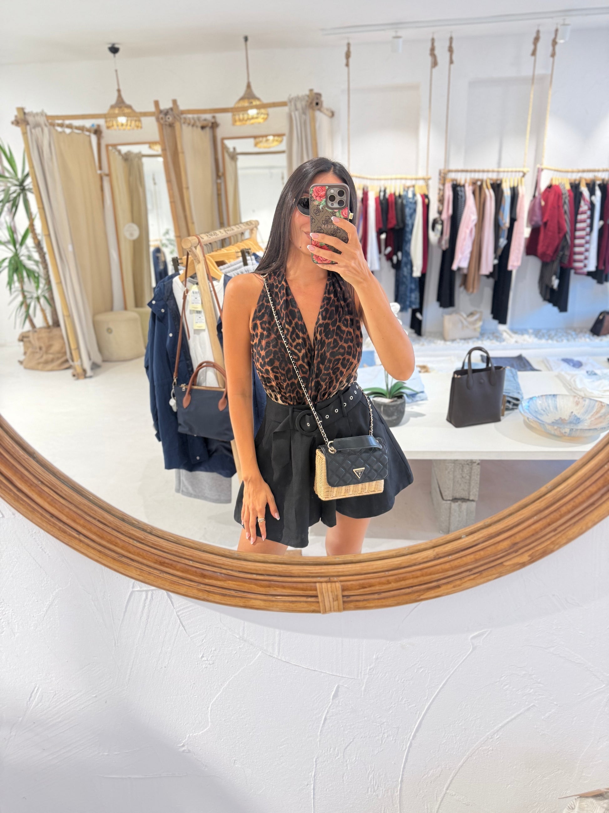 Leopar Desen Sırt Detaylı Boyundan Bağlamalı Tül Bodysuit