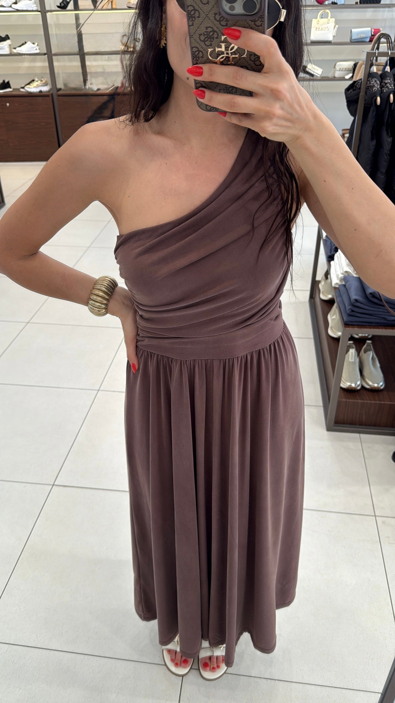 TEK OMUZ KAHVERENGİ ELBİSE